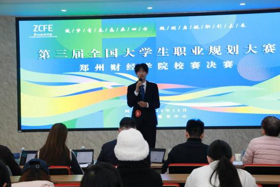 12月16日,第三届全国大学生职业规划大赛郑州财经学院校赛决赛在德正楼第一学术报告厅举行。牧原食品股份有限公司招聘经理金太、郑州中科集成电路与系统应用研究院高级工程师白杰、高途郑州中原总部校招负责人张庆波、郑州百事饮料有限公司省区高级招聘经理李宗伟、郑州财经学院高级就业指导师、副教授刘燕燕出席并担任比赛评委。相关校领导、各二级学院就业信息联络员、参赛选手指导老师、就业指导服务中心人员以及学生代表在现场观摩比赛。